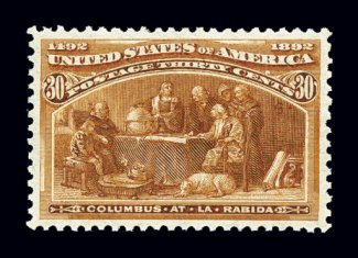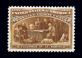 307 nh 239 image#239, 30c Columbian, an exquisite mint single possessing uncommon freshness, beautifully centered amid extraordinarily large margins, luxuriously rich color and a sharp impression, unusually full and even perforations surround the whole, immaculate o.g., never hinged, extremely fine; 2000 PF certificates for both a single and block of four from which this was taken. (Image) $750.00