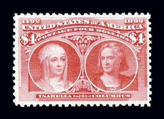 315 nh 244 image#244, $4.00 Columbian, an impressive mint single in the Crimson lake shade, being fabulously fresh and in a true "post office" fresh state of preservation, rich radiant color and a crisp clean impression, wonderfully well centered within generous margins and possessing full even perforations all around, immaculate clean o.g. which has never been hinged, light natural paper inclusion, choice very fine; a desirable example of this commemorative that is exceedingly difficult to locate in never hinged condition. (Image) $8,000.00