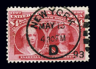 316 O 244 image#244, $4.00 Columbian, eye-catching used single with beautifully struck "New York/D/May 13 93" c.d.s. of a duplex, stamp has brilliant crimson lake color, very fine for this; ex-"Ganymede". (Image) $1,300.00