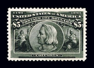 317 og 245 image#245, $5.00 Columbian, the mint example offered here of this scarce and popular high value commemorative is, unquestionably one of the most spectacular quality mint singles in existence, as this remarkable stamp features several eye-arresting physical characteristics, any one of which would be exciting, but to have all of them converge on a single stamp is an almost impossible occurrence, including being absolutely perfectly centered amid the most enormous jumbo margins imaginable for a Five Dollar Columbian, its color and impression could not be more prooflike on the brightest paper possible, as opposed to the yellowish toned paper so often seen on this value, its reverse is equally impressive, possessing full clean o.g. which has been lightly hinged, extremely fine; an incomparable gem which would grace the finest collection of premium quality United States stamps; 1996 PF certificate. (Image) $3,000.00