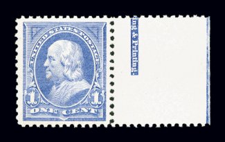 318 nh 246 image#246, 1c Ultramarine, gem mint right sheet-margin partial imprint single, incredibly well centered amid extravagantly large margins, deep rich color, pristine o.g., n.h., extremely fine and striking; photocopy of a 1994 PF certificate for an imprint and plate number strip of three from which this stamp was taken. (Image) $85.00