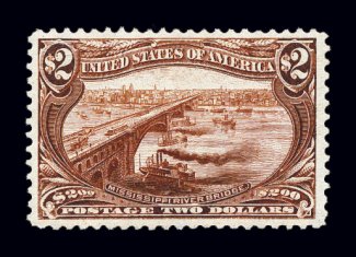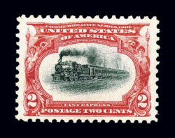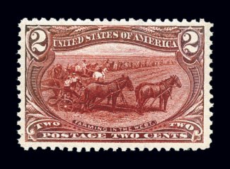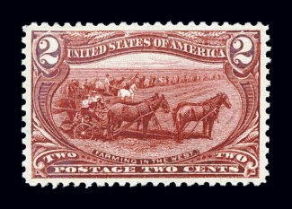 396 og 293 image#293, $2.00 Trans-Mississippi, a premium quality mint example of this notoriously difficult commemorative, being incredibly well centered within uncharacteristically large margins, with especially rich and luxuriant color which shows no trace of oxidization that affects so many, plus its impression is crisp and sharp on immaculate paper, full clean o.g., very lightly hinged, extremely fine; an elusive and desirable stamp so choice; 1995 PF certificate. (Image) $2,100.00