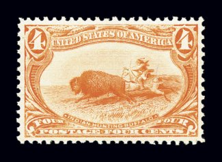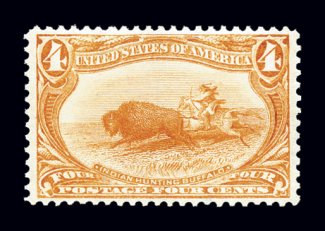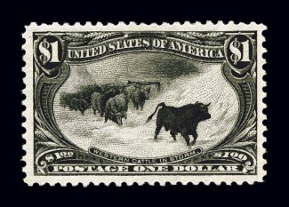 395 og 292 image#292, $1.00 Trans-Mississippi, an especially handsome mint example of this always popular high value commemorative, strong rich color and a clean impression on bright paper, wonderfully well centered within uncharacteristically large margins, o.g., lightly hinged, extremely fine; 1972 and 1992 PF certificates. (Image) $1,250.00
