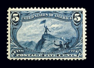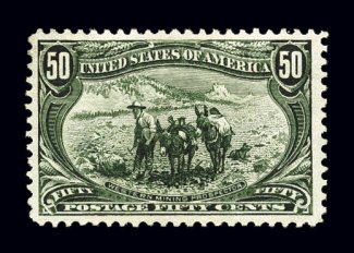 394 og 291 image#291, 50c Trans-Mississippi, an eye-appealing mint example, featuring especially deep and luxuriant color, sharp detailed impression, exceptionally well centered within uncommonly large margins, o.g., very lightly hinged, extremely fine; 1982 PF certificate. (Image) $700.00