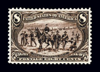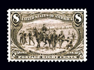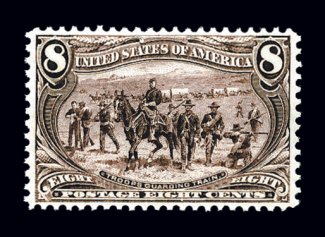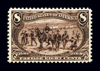 388 nh 289 image#289, 8c Trans-Mississippi, exceptionally well centered for this difficult value, plus its margins are uncharacteristically wide, strikingly rich color in a particularly deep shade, razor-sharp impression, o.g., never hinged, extremely fine; 1994 PF certificate. (Image) $475.00
