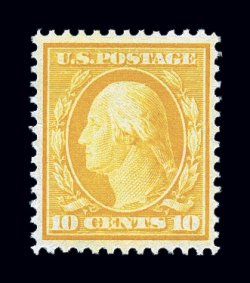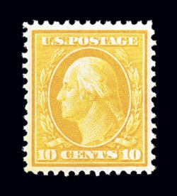 494 og 356 image#356, 10c Yellow coil, perf. 12 vert., an incomparable quality mint pair of this important coil rarity, being in a condition that is truly spectacular, possessing flawless centering amid enormously large margins on each stamp, plus its color is absolutely radiant and completely free of the oxidizing often encountered, even its impression is incredibly detailed, pristine o.g. that is devoid of any gum bends or skips, so faintly hinged that it is almost impossible to detect, superb; quite likely the finest pair of the Ten Cent 1909 Coil in existence in terms of centering, margins, color and state of gum preservation; 1982 PF and 2001 PSE certificates; ex-Floyd. (Image) $6,750.00