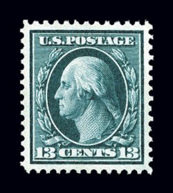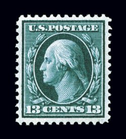 484 nh 339 image#339, 13c Blue green, a gem mint single with beautifully balanced and unusually wide margins, deep luxuriant color and a crisp impression, o.g., n.h., extremely fine; an especially choice stamp; 1990 PF certificate. (Image) $90.00