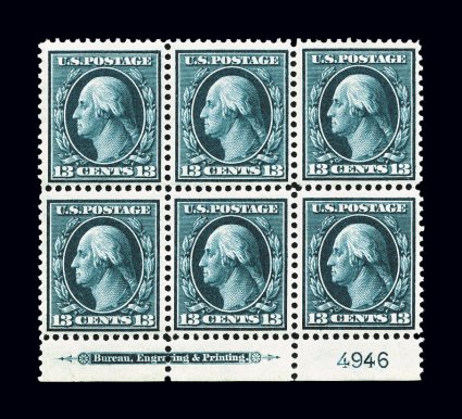 485 nhPB 339 image#339, 13c Blue green, bottom margin imprint and plate no. 4946 block of six, brilliantly fresh color, o.g., n.h., a few small natural gum bends, very fine. (Image) $850.00