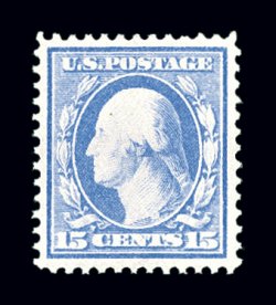 486 nh 340 image#340, 15c Pale ultramarine, gem mint single, wonderfully fresh color on bright crisp paper, virtually perfect centering within uncharacteristically large margins, flawless o.g., n.h., extremely fine; actually a terribly elusive stamp to find both never hinged and in such choice quality; 2001 PSE certificate. (Image) $150.00