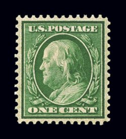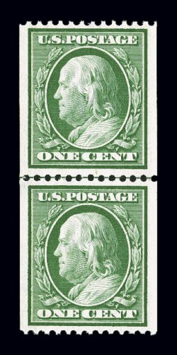 490 nh 348 image#348, 1c Green coil, perf. 12 horiz., guide line pair, incredibly well centered and margined, sumptuously rich color and impression, immaculate o.g., n.h., extremely fine; an especially scarce and desirable line pair in this outstanding condition; 2001 PF certificate. (Image) $600.00