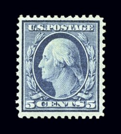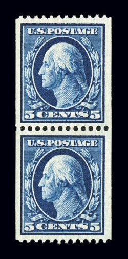491 og/nh 351 image#351, 5c Blue coil, perf. 12 horiz., handsome mint pair, exceptionally well centered and margined for a perf. 12 coil, prooflike color and impression on bright paper, o.g., top stamp lightly hinged, bottom stamp n.h., extremely fine. (Image) $550.00+