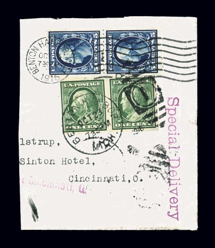 492 O 351 image#351, 5c Blue coil, perf. 12 horiz., an extraordinarily rare used guide line pair, tied to piece along with horizontal pair of 1c Green imperforate (#343) by neat "Benton Harbor, Mich./Oct. 23/1916" machine and duplex handstamp cancels, line pair with sumptuously rich color and is rather well centered, very fine; only a handful of used certified #351 line pairs exist; 1995 PF certificate. (Image) $2,750.00