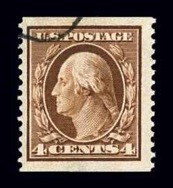 493 O 354 image#354, 4c Orange brown coil, perf. 12 vert., an incredibly lightly cancelled used single, well centered within large margins, rich color and a sharp impression, extremely fine; a difficult single to find both used and certified, especially in this choice condition; 1981 PF certificate for a pair, this being the left stamp; ex-"Ganymede". (Image) $150.00