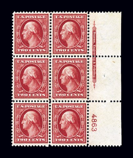 497 ogPB 358 image#358, 2c Carmine on bluish paper, right margin imprint and plate no. 4863 block of six, well centered and fresh, o.g., lightly hinged, very fine. (Image) $1,000.00