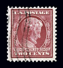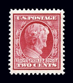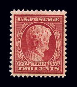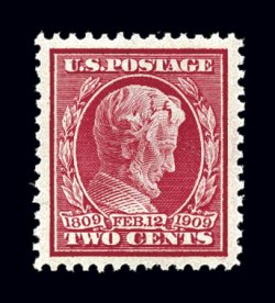 502 nh 369 image#369, 2c Lincoln on bluish paper, a fabulous quality mint single, being in a condition that would please even the most fastidious collector, possessing an incredible overall brilliance and freshness, gorgeous intense color and impression on bright paper, flawlessly centered amid extravagantly large margins, immaculate o.g., n.h., extremely fine; a gem in every regard; easily among the finest 1909 Two Cent Lincoln commemoratives on bluish paper we have ever offered in our auctions. (Image) $425.00