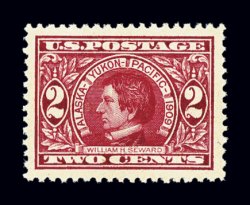 505 nh 370 image#370, 2c Alaska-Yukon, uniformly huge margins all around, incredibly intense color in a deep shade, pristine o.g., n.h., extremely fine gem; a premium jumbo-margined mint example; 2005 PSE certificate (XF-Superb 95); ex-Jarrett. (Image) $17.50