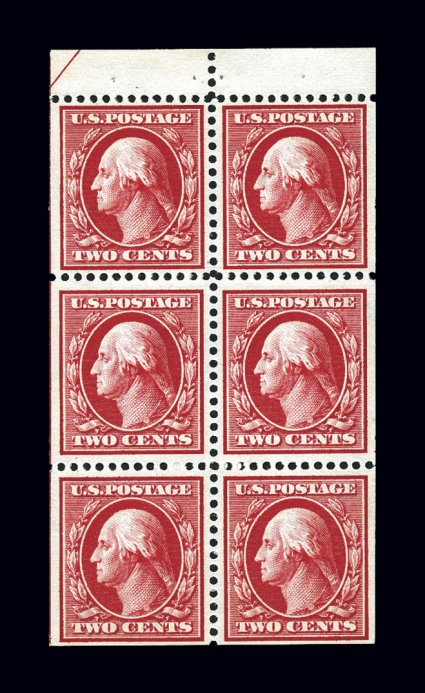 506 nhBP 375a image#375a, 2c Carmine booklet pane of six, position C, with split arrow and guide line at left, beautiful vibrant color and a crisp detailed impression on bright paper, o.g., never hinged, a very fine example of this scarce position, which occurs only once on the 360 subject plate. (Image) $200.00+