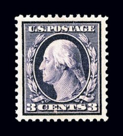 507 nh 376 image#376, 3c Deep violet, Ty. I, a gem single, boasting four enormously large and perfectly balanced margins, gorgeous intense color and impression, immaculate o.g., n.h., extremely fine; a truly impressive stamp; 2000 PSE certificate (XF-Superb 95) (Image) $45.00