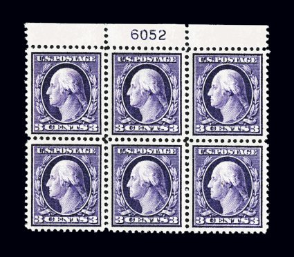 508 nhPB 376 image#376, 3c Deep violet, Ty. I, top margin plate no. 6052 block of six, intense prooflike color and impression on brilliantly white paper, excellent centering as well, o.g., n.h., extremely fine and quite choice. (Image) $400.00