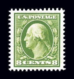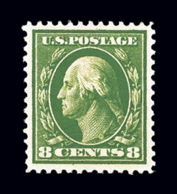 518 nh 380 image#380, 8c Olive green, a breathtakingly beautiful example of this value, featuring absolutely enormous margins and being incredibly well centered within them, even its color is out of the ordinary, as it is quite intense and bright, pristine o.g., n.h., an extremely fine gem and the epitome of a jumbo; 2000 PF certificate and a 2005 PSE certificate (XF-Superb 95 Jumbo); ex-Jarrett. (Image) $250.00