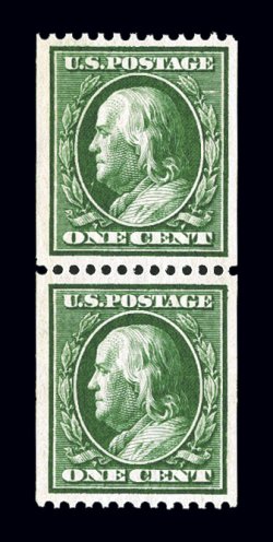 520 nh 385 image#385, 1c Green coil, perf. 12 horiz., pair, virtually perfect centering with large margins on each stamp (including at top and bottom, a seldom seen occurrence extraordinarily intense color and impression, o.g., n.h., extremely fine; a gem coil pair; 2001 PF certificate. (Image) $230.00