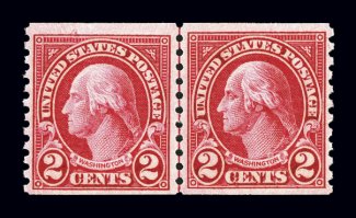 721 nh 599, 599A image#599, 599A, 2c Carmine coil, Ty. I and Ty. II combination joint line pair, a wonderfully choice mint example of this rare coil, deep luxuriant color and impression, well centered, o.g., n.h., extremely fine for this; 1994 PF certificate. (Image) $1,400.00