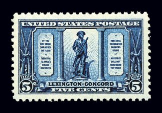 722 nh 619 image#619, 5c Lexington-Concord, huge perfectly balanced margins, prooflike color and impression, pristine o.g., n.h., extremely fine gem; definitely not your typical quality Five Cent Lexington-Concord commemorative; 2005 PSE certificate (XF-Superb 95); ex-Jarrett. (Image) $32.50
