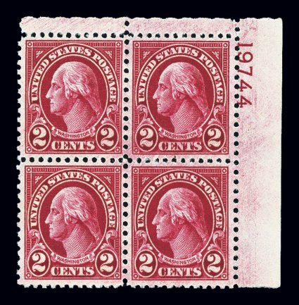 724 nhPB 634A image#634A, 2c Carmine, Ty. II, top right corner margin plate no. 19744 block of four, exceptionally well centered, radiant rich color, o.g., n.h., extremely fine; an elusive plate block that is especially rare in this choice quality. (Image) $2,750.00