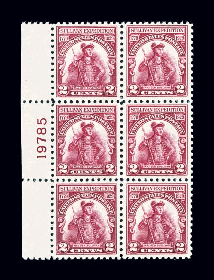 725 nhPB 657a image#657a, 2c Sullivan, lake shade, an extremely rare left margin plate no. 19785 block of six of this distinctive color error, wonderfully fresh, with strong unmistakable color, well centered, pristine o.g., n.h., a very fine and choice example of this important 20th century plate block; 2001 PF certificate. (Image) $3,750.00