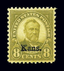 729 ogPB 666 image#666, 8c "Kans." ovpt., bottom left corner margin plate no. 18192 block of four, incredibly well centered, especially for this key value, sumptuously rich color, o.g., lightly hinged, extremely fine; rarely encountered in such outstanding condition. (Image) $775.00