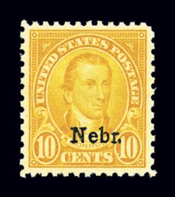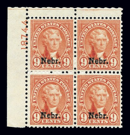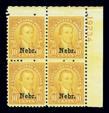 736 ogPB 679 image#679, 10c "Nebr." ovpt., top right corner margin plate no. 19234 block of four, well centered, rich color, o.g., lightly hinged, top right stamp with tiny surface scuff, otherwise very fine. (Image) $925.00