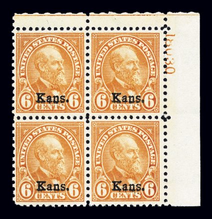 727 ogPB 664 image#664, 6c "Kans." ovpt., top right corner margin plate no. 18030 block of four, nicely centered, o.g., stamps n.h., lightly hinged in the selvage only, very fine. (Image) $450.00