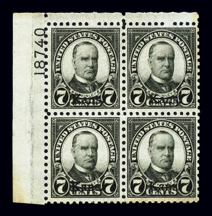 728 nhPB 665 image#665, 7c "Kans." ovpt., top left corner margin plate no. 18740 block of four, uncharacteristically well centered, fresh and intact, o.g., n.h., choice very fine. (Image) $700.00