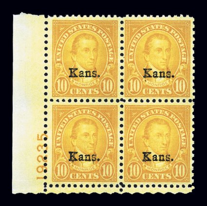 730 nhPB 668 image#668, 10c "Kans." ovpt., bottom left corner margin plate no. 19235 block of four, well centered, beautiful rich color, o.g., n.h., very fine; 1977 PF certificate. (Image) $550.00