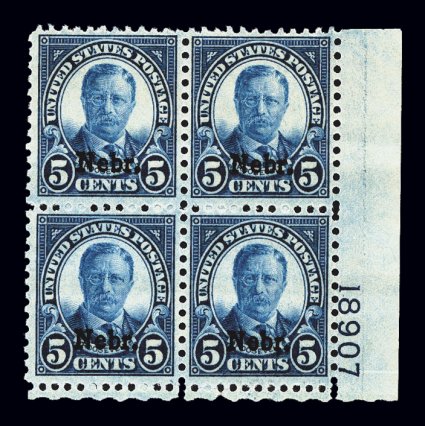 732 nhPB 674 image#674, 5c "Nebr." ovpt., bottom right corner margin plate no. 18907 block of four, deep color, o.g., n.h., choice very fine. (Image) $400.00