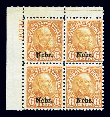 733 nhPB 675 image#675, 6c "Nebr." ovpt., top left corner margin plate no. 18037 block of four, attractive color, o.g., n.h., fine-very fine. (Image) $750.00