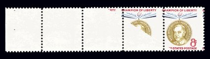 739 nh 1137a image#1137a, 1137d, 8c Reuter, ocher omitted and all colors omitted, a striking left sheet-margin transitional strip of four containing single examples of each of the two color omitted errors, from the unique sheet which had a piece of paper on top of the sheet during the printing process, this strip is positions 9-12, position 10 is the ocher omitted error of which there are only three such errors known from the sheet, while position 9 is the all colors omitted error, of which there are only six examples on the sheet, o.g., n.h., very fine; a spectacular and immensely rare missing color multiple error; the ocher omitted error (#1137a) catalogs $4,250.00, while the all colors omitted error (#1137d) catalogs $2,500.00; photocopy of a 1996 PF certificate for the unique complete sheet before it was broken up; ex-Floyd. (Image) $6,750.00+
