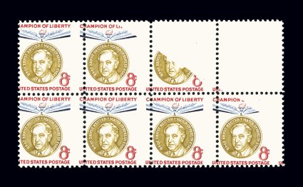 740 nhbl 1137b, 1137c image#1137b, 1137c, 8c Reuter, ultramarine omitted, and ocher and ultramarine omitted, block of eight, being positions 34-37/42-45 from the unique sheet which had a piece of paper on top during the printing process, position 36 is the ultramarine omitted error, while position 37 is the ocher and ultramarine omitted error, o.g., n.h., very fine; with only two example of #1137c and three examples of #1137b existing, this makes for an incredibly rare combination of errors; #1137b catalogs $4,250.00, #1137c catalogs $4,500.00. (Image) $8,750.00+