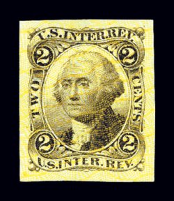 942 E Turner Essay 57-A imageTurner Essay 57A, 2c U.S. Inter. Rev., plate essays on white wove paper, three different including bottom sheet margin single in black brown on thin paper, grey black on thick paper (ex-Joyce), and scarce type II experimental orange overprint on this same black essay on medium paper, very fine and a nice selection of this value. (Image) Est. 300-400