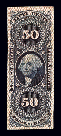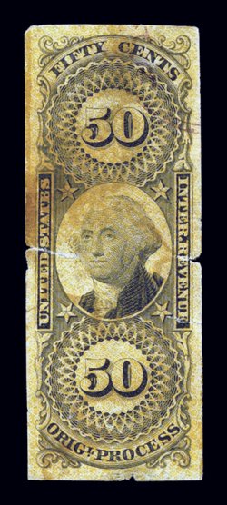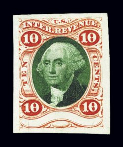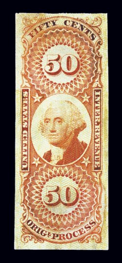946 E Turner Ty. V imageTurner Type V, 50c Foreign Exchange, red experimental overprint of a single line mesh network covering the entire stamp on blue plate proof on card, (#R56P4), four large margins, rich colors, shallow card thins, very fine appearance; extremely rare and attractive. (Image) Est. 400-500