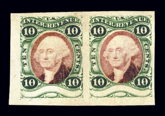 944 E Turner Essay 59A, 59B imageTurner Essay 59A, 59B, 10c Design without title, plate essays on white and buff wove paper, four horizontal pairs in different color combinations including red and ultramarine, ultramarine and red on white wove paper, and purple and green and green and purple on buff wove paper, all are nicely margined, two with unobtrusive creases, otherwise very fine. (Image) Est. 400-500