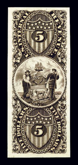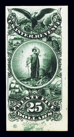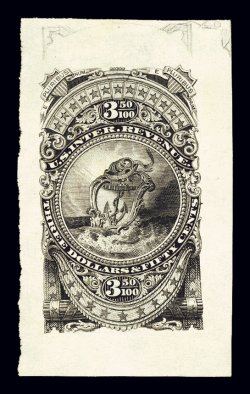 950 E Turner Essay 76 imageTurner Essay 76, $3.50 Rhode Island arms vignette, die essay, black on India paper mounted on original card, 35x64mm, exceptionally sharp impression, fresh and choice very fine; ex-Joyce. (Image) Est. 200-300