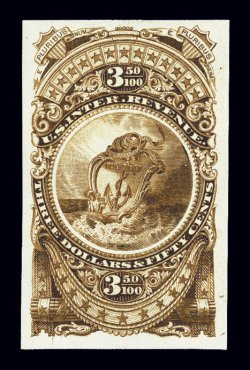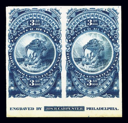 952 E Turner Essay 76-A imageTurner Essay 76-A, $3.50 Rhode Island arms vignette, plate essay, blue on card, bottom margin horizontal pair numbered 118-119, with "Jos. R. Carpenter" imprint at bottom from the plate of eight, full large margins all around, very fine and choice. (Image) Est. 150-200