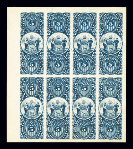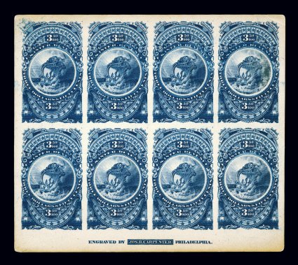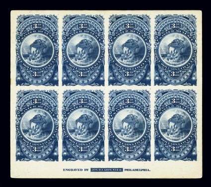 953 Ebl Turner Essay 76-A imageTurner Essay 76-A, $3.50 Rhode Island arms vignette, plate essay, blue on card, complete plate of eight subjects, with "Jos. R. Carpenter" imprint at bottom, numbered 161-168, huge margins all around, fresh and lovely example of the full plate; scarce and particularly attractive as a full pane. (Image) Est. 400-500