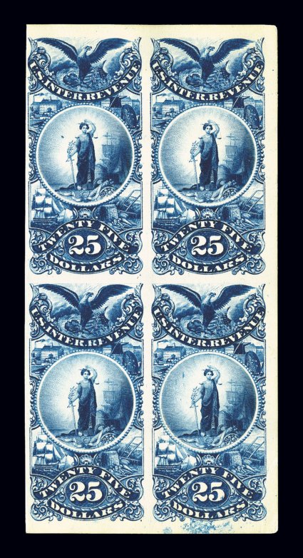 958 Ebl Turner Essay 78-A imageTurner Essay 78-A, $25.00 Maryland arms vignette, plate essay, blue on card, right margin block of four from the small plate of eight subjects, numbered 217/218, 221/222, the bottom right position showing prominent plate flaws, margins well clear to large sheet margins, very fine and choice block. (Image) Est. 150-200