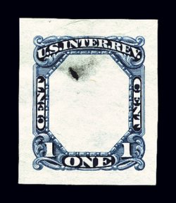 960 E Turner Essay 80 imageTurner Essay 80, 1c Blue, die essay of frame on India paper, 24x29mm, thin breaking through in the vignette area, still attractive and otherwise retaining its very fine appearance; the die proofs of the frames of the Second and Third Issue revenues are very rare, the Morton Dean Joyce collection had virtually one example each of the low values and they were almost invariably faulty to a greater or lesser extent; ex-Joyce. (Image) Est. 150-200