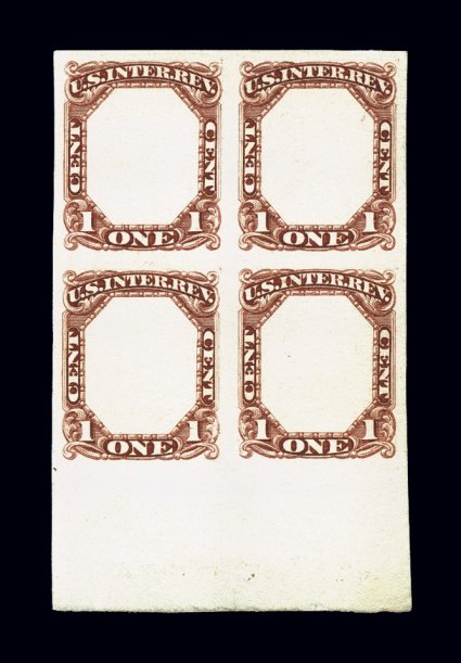 963 Ebl Turner Essay 80 var. imageTurner Essay 80 var., 1c Brown, plate essay of frame on card, handsome bottom sheet-margin block of four with large margins on the other three sides as well, numbered 185-186/199-200, extremely fine and rare; unlisted by Turner. (Image) Est. 500-750