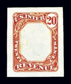 967 E Turner Essay 88 imageTurner Essay 88, 20c Rose (orange), die essay of frame on India paper, 25x31mm, one of the few known frame die proofs that is basically sound having just a bare trace of thinning, otherwise very fine and very rare; probably unique; ex-Joyce. (Image) Est. 300-400