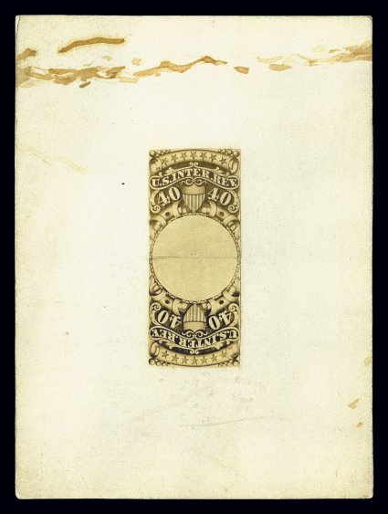 975 E Turner Essay 108 imageTurner Essay 108, $200.00 "Small Persian Rug" brown red, blue green and black, model essay composed of lathework sections, figures, lettering and vignette pasted on a large card, 117x163mm, also has corners drawn in using ink plus the backgrounds of six wiggly or wavy patterns "painted" in, only three value tablets and no "CC" in the top corners or "$" in front of the bottom numerals of value, signed "Jos. R. Carpenter" in his hand at base, some negligible soiling, very fine; the unique example of this original model essay and arguably the most important of all the revenue essays in light of the fact that it is one of only a couple pieces known actually signed by Carpenter; illustrated in Turner on page 60, ex-Joyce and illustrated on the back cover of that catalog. (Image) Est. 10,000-15,000