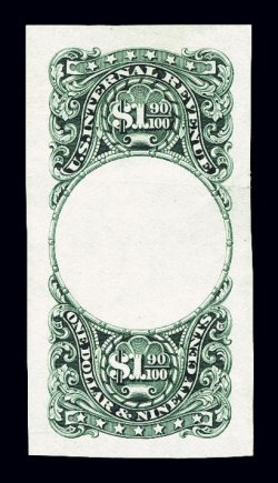 972 E Turner Essay 99 imageTurner Essay 99, $1.90 Blue green, die essay of frame on India paper, 29x54mm, handsome essay of this scarce value, rich color and detailed impression on bright white paper, light unobtrusive horizontal crease, otherwise extremely fine and very rare; probably unique; ex-Joyce. (Image) Est. 400-500